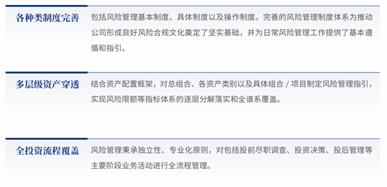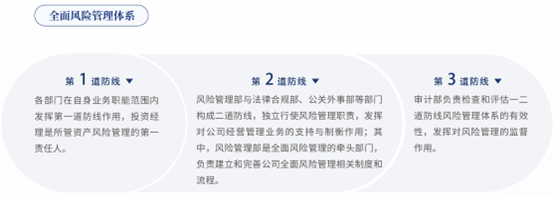 在执行层面,公司严格执行“三道防线”,形成了各种类制度完善、多层级资产穿透、全投资流程覆盖的全面风险管理体系。
