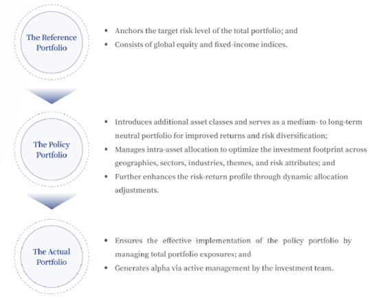 The company has adopted a portfolio construction framework that consists of a reference portfolio, a policy portfolio, and the actual portfolio. Under this framework, total portfolio returns are determined by reference portfolio selection, policy portfolio construction, and actual portfolio management.